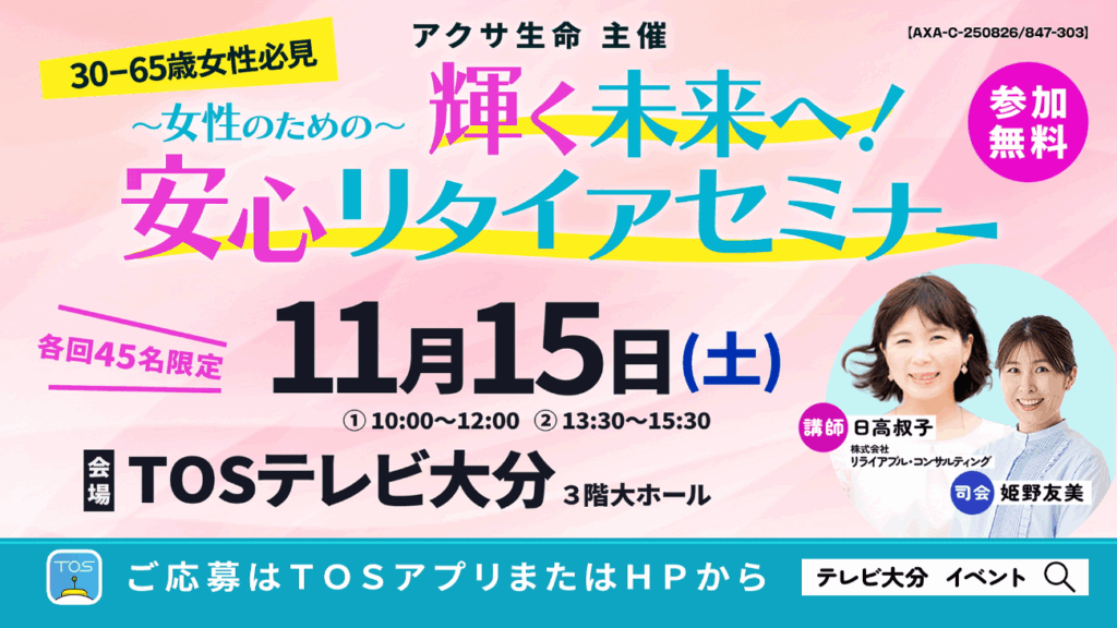 ~輝く未来へ!安心リタイアセミナー~(アクサ生命 presents・協力:TOSテレビ大分:無料セミナー)は定員になり次第締め切りとさせていただきます!