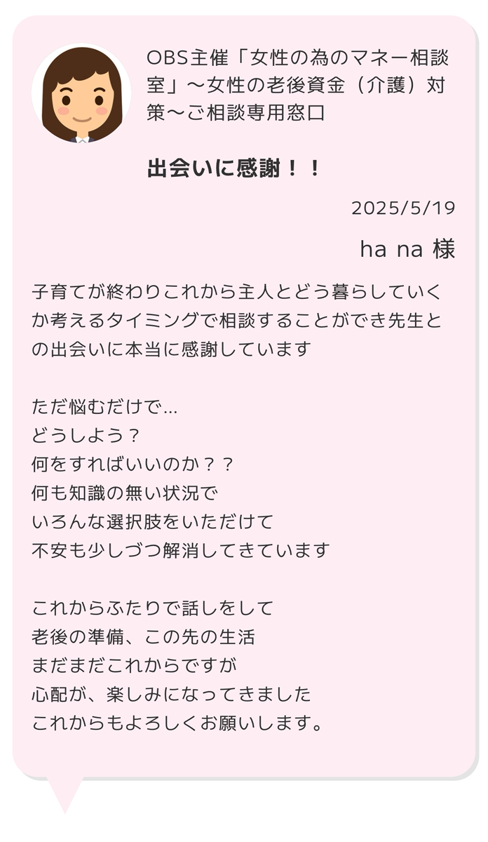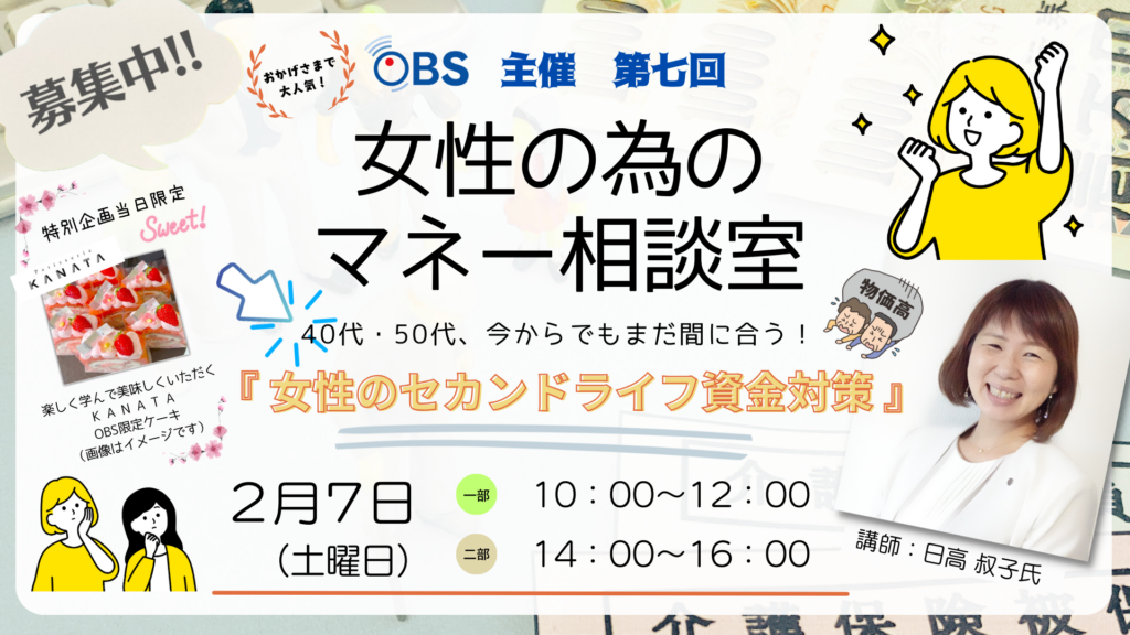 OBS 主催 第7回 無料マネーセミナー「女性の為のマネー相談室」~ 「女性のセカンドライフ資金対策」編 ~開催のお知らせ | 女性の為のマネー相談室